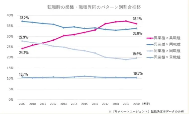 また、リクルートエージェントでは、年々異業種・異職種への転職率が増加しているため、未経験での転職も前向きに検討できます。